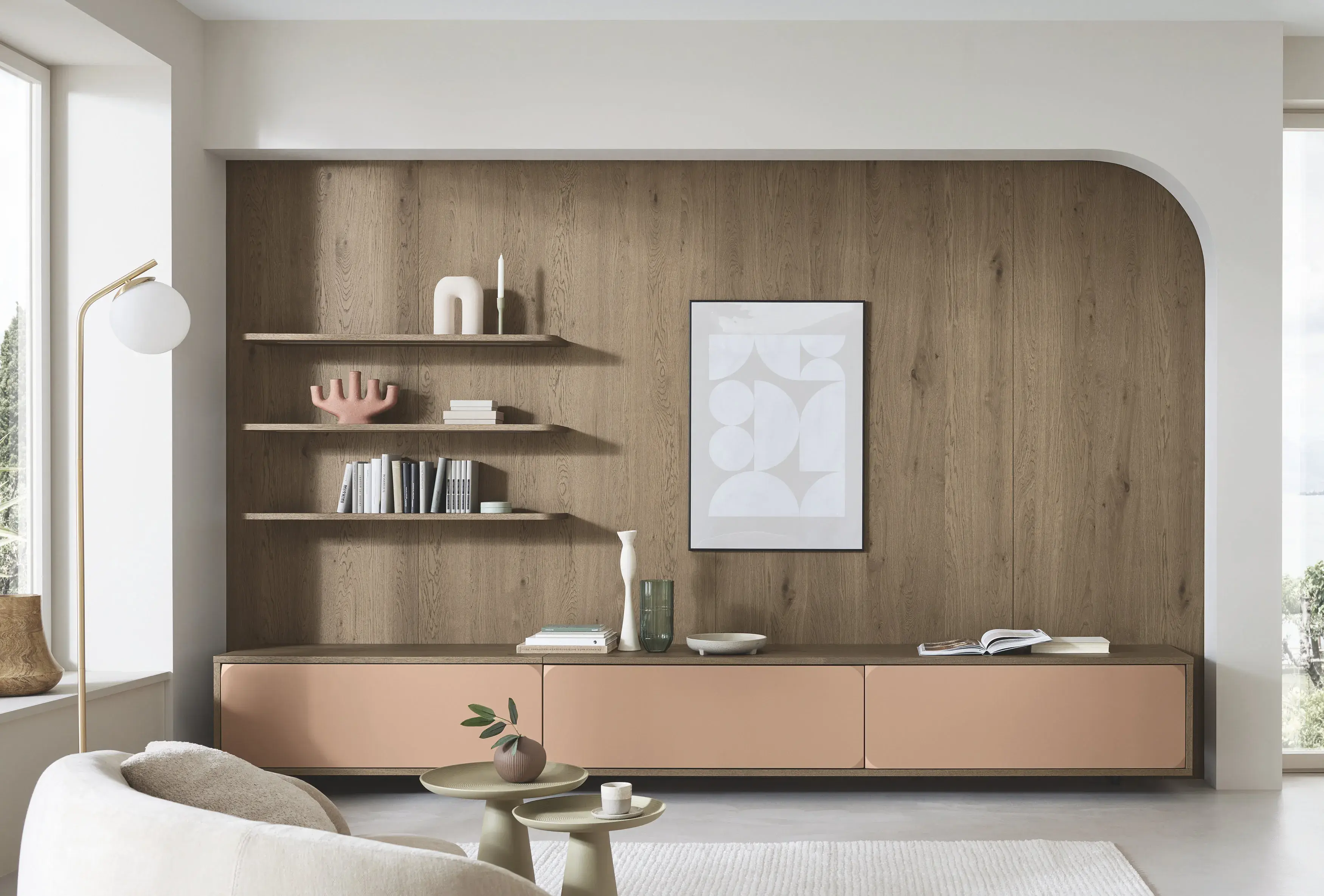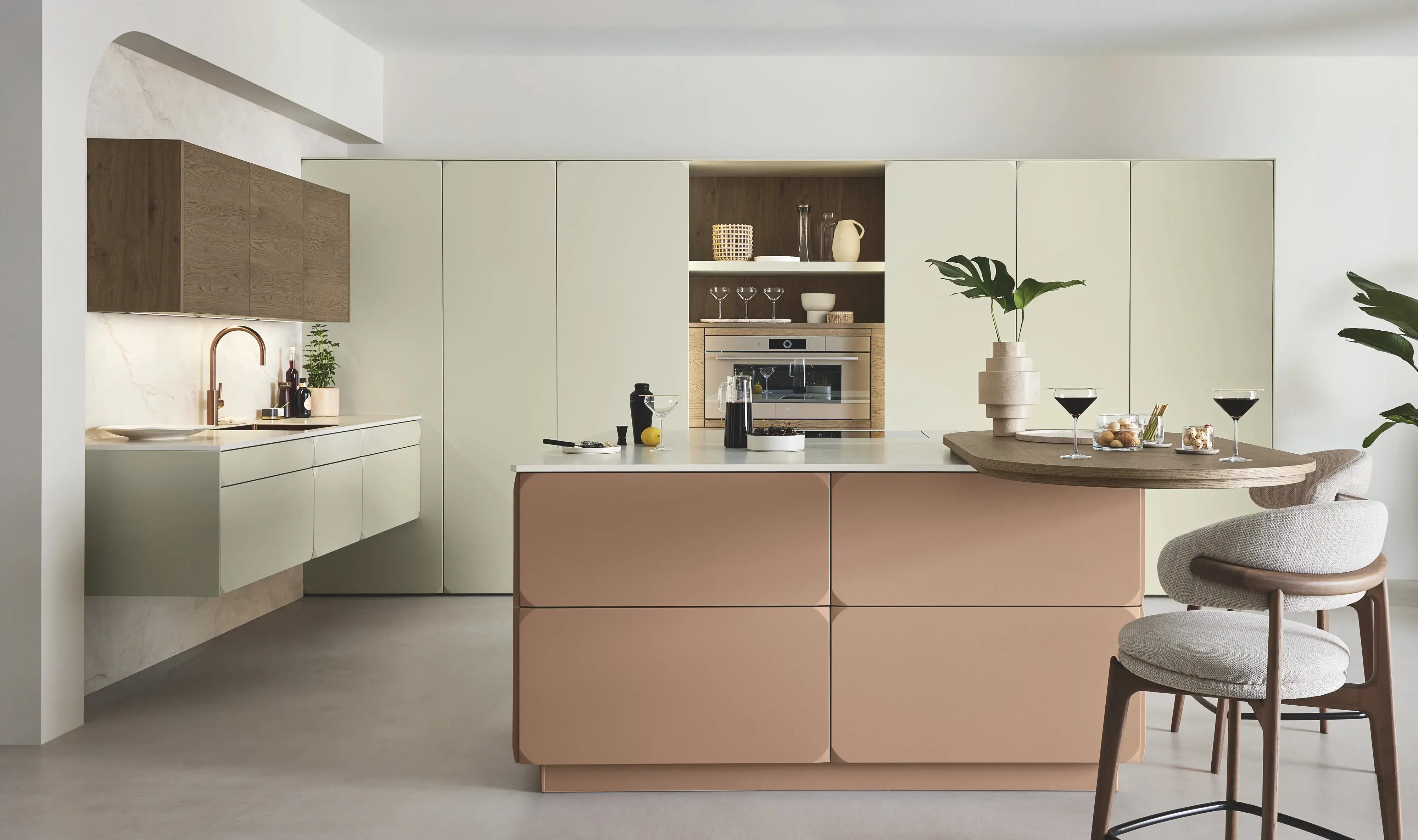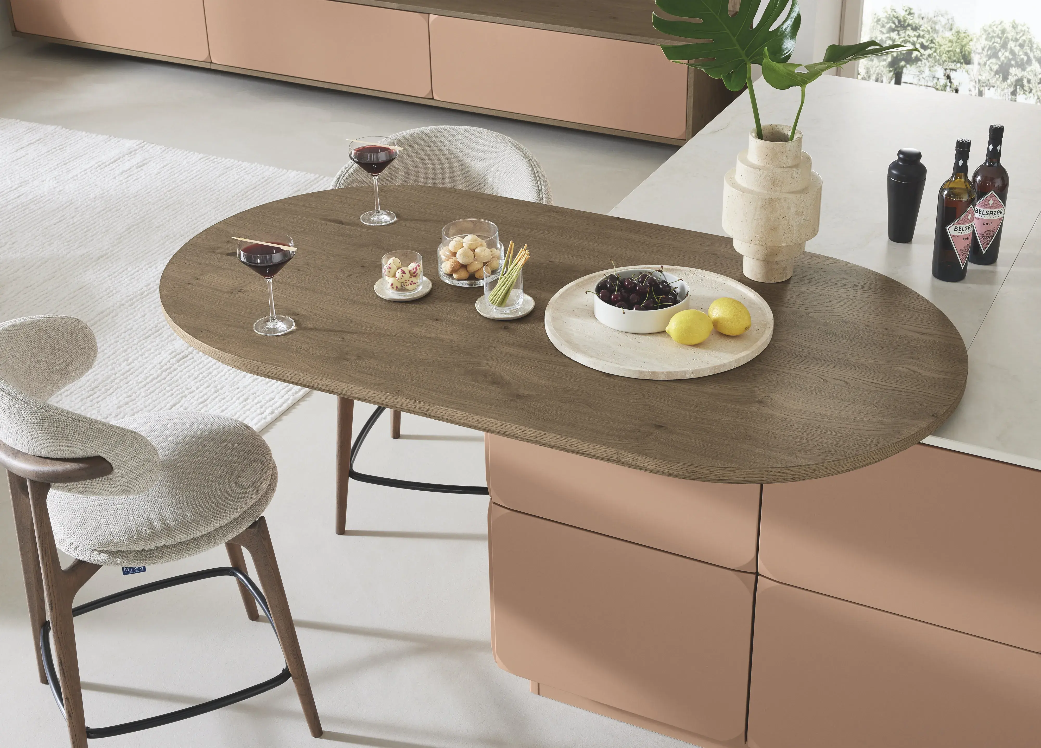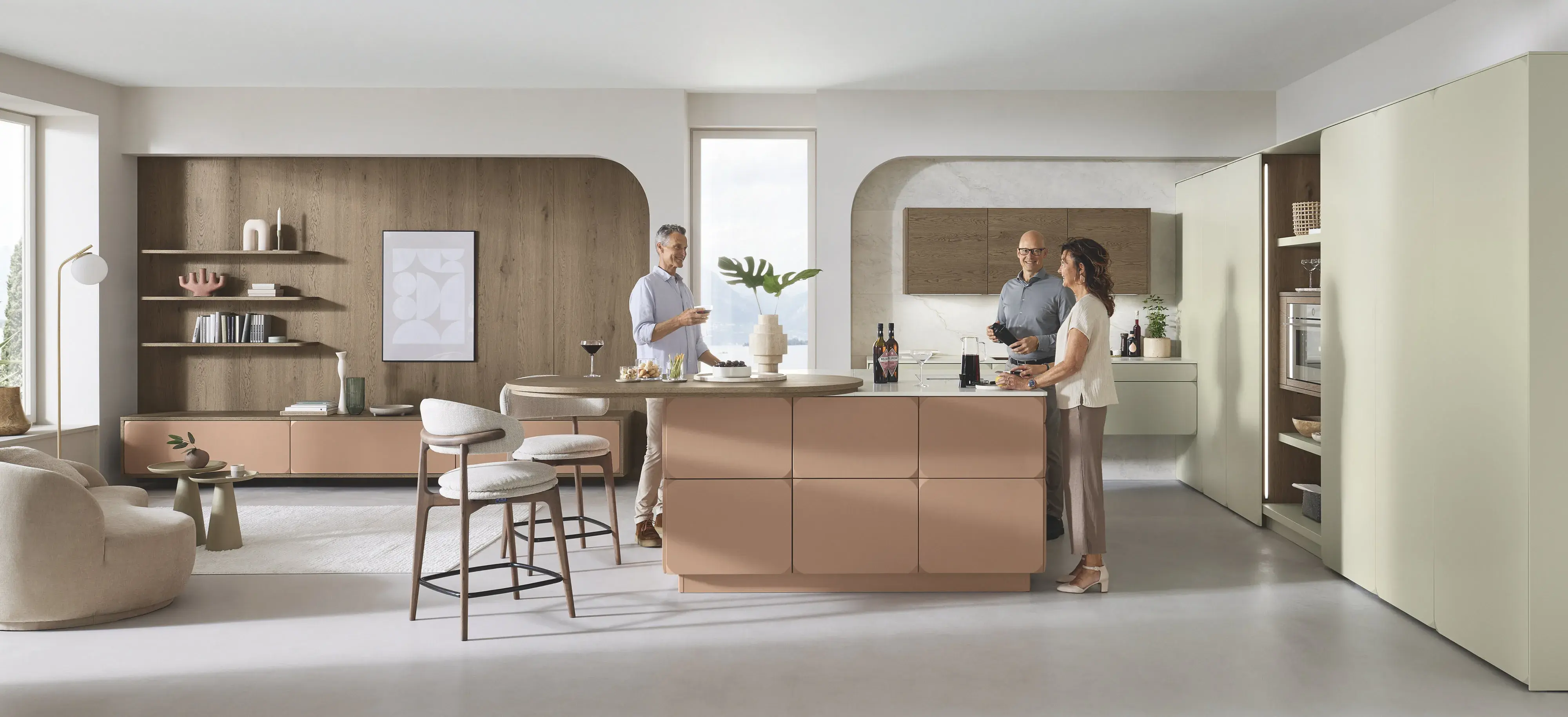 Die wandhängende Spülenzeile in 61 cm Tiefe glänzt im italienischen Design, genauso wie die seitlich überstehenden Fronten, die den zurückversetzten Backofen rahmen. Charaktergebend sind organische Formen: der oval furnierte Tisch und die Steckborde im angrenzenden Wohnbereich. Das warme Holzfurnier des Moderno Rustico harmonisiert mit dem ovalen Tisch der angrenzenden Küchenplanung.